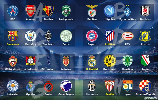 (Group D we will see a rematch of last season's semifinals: Bayern x Atletico de Madrid. Both will pass for the 1/16).